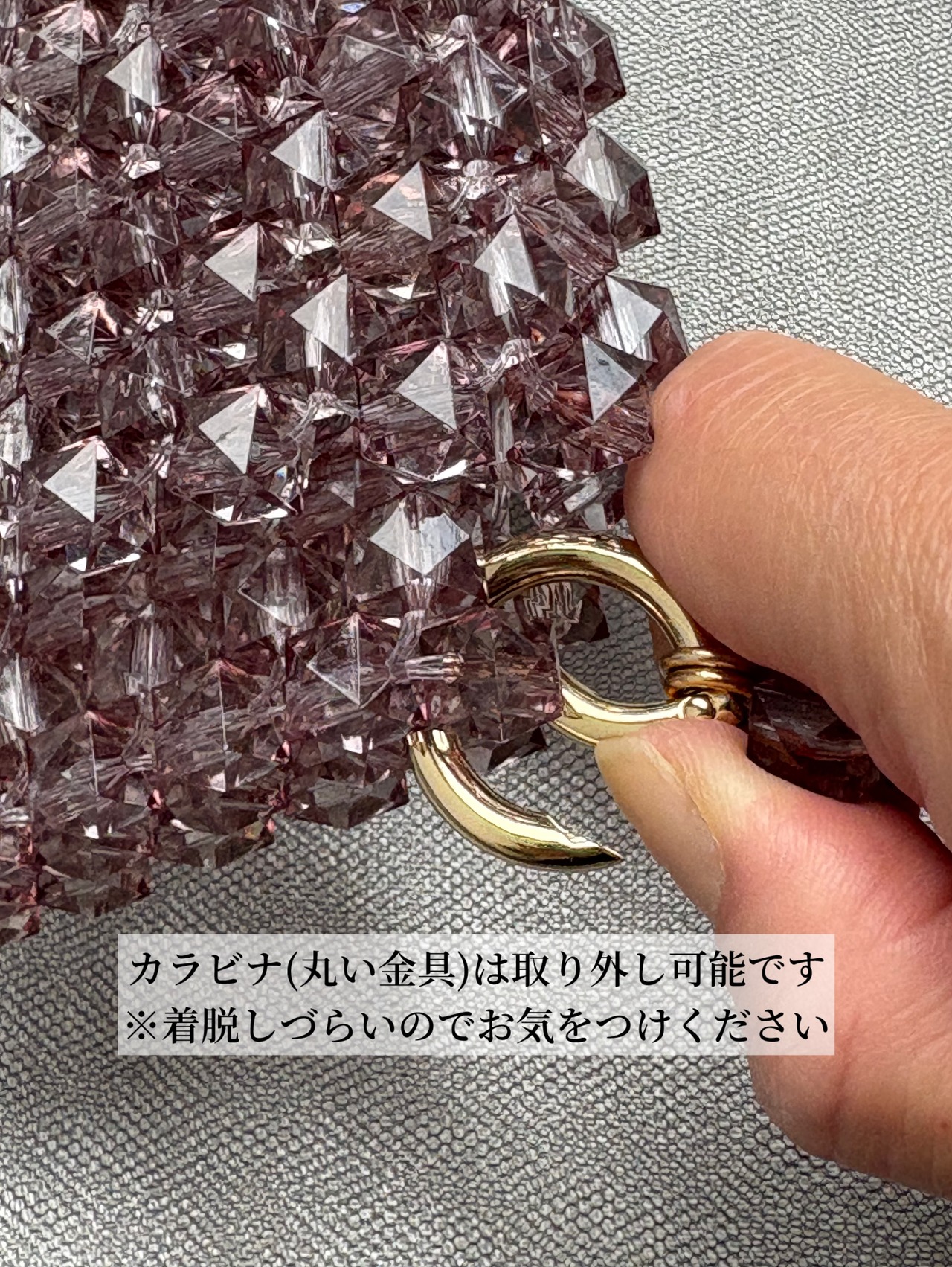 ※使用しているビーズは安全なものを厳選しておりますが、特に角ばった形状のビーズはお召し物やバッグこ素材(サテン、レース、チュール、ニット、コート、お着物など)に引っかかりやすい場合がございますので、十分にご注意ください。