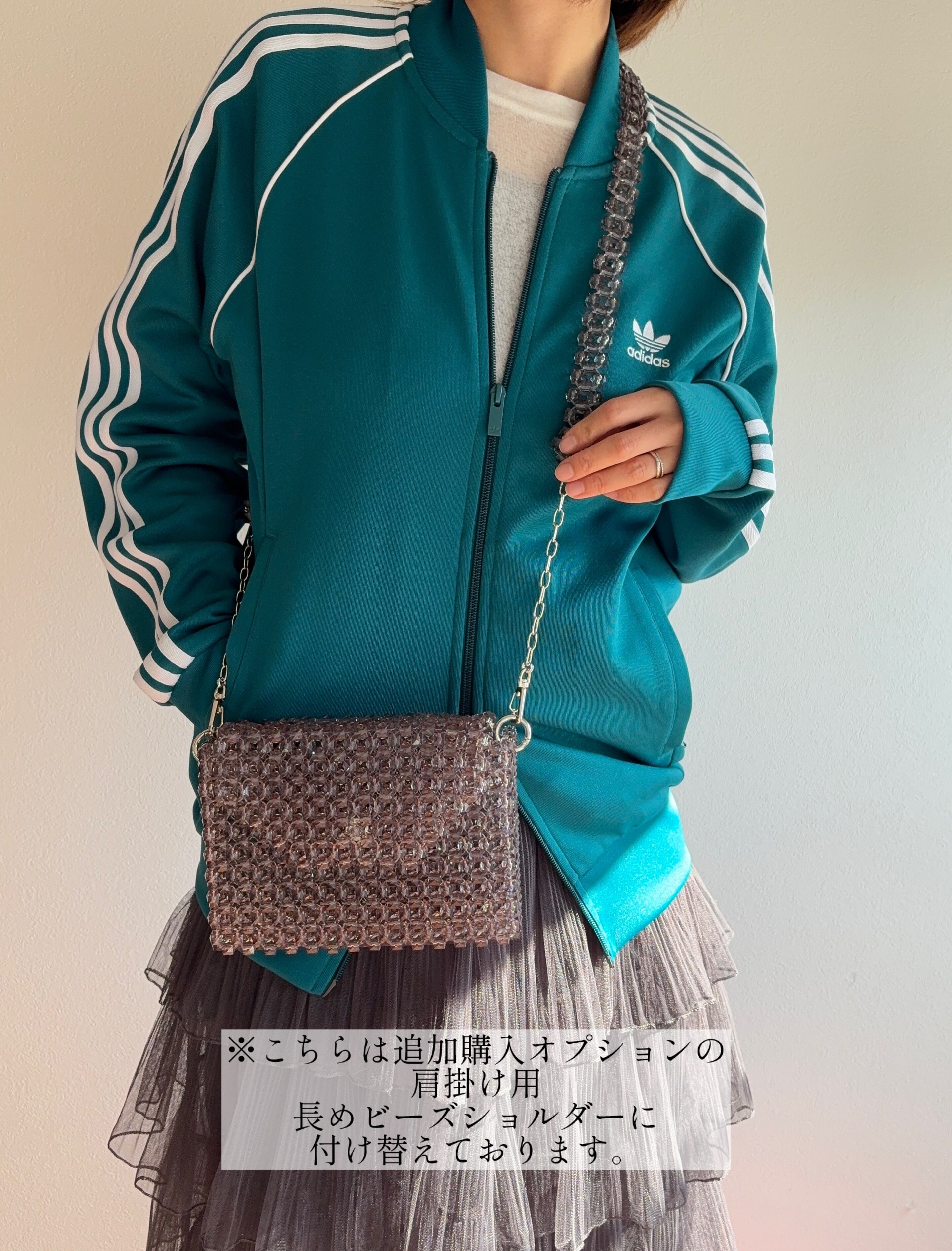 追加購入オプションで長めビーズショルダーもご用意しており、チェーンは調整可能で自分好みのスタイルで楽しむことができます。